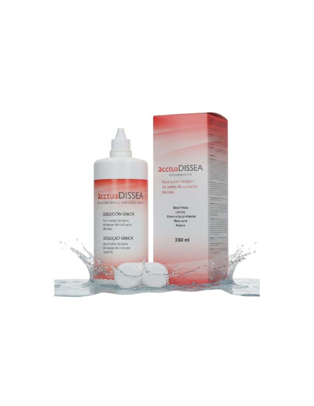 Acctua DISSEA 380 ml, es una solución única, limpia, aclara, desinfecta, humecta y conserva todo tipo de lentes de contacto blandas, incluidas las de hidrogel de silicona.