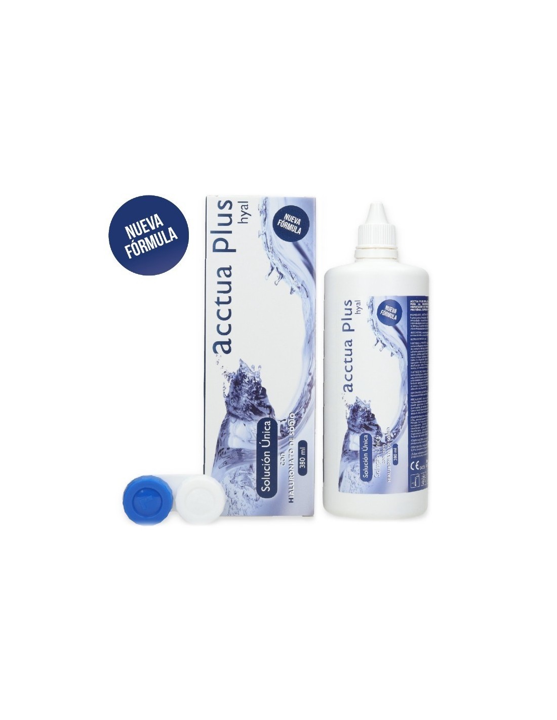 Acctua Plus Hyal 380 ml, es una solución única, limpia, aclara, desinfecta, humecta y conserva todo tipo de lentes de contacto blandas, incluidas las de hidrogel de silicona.