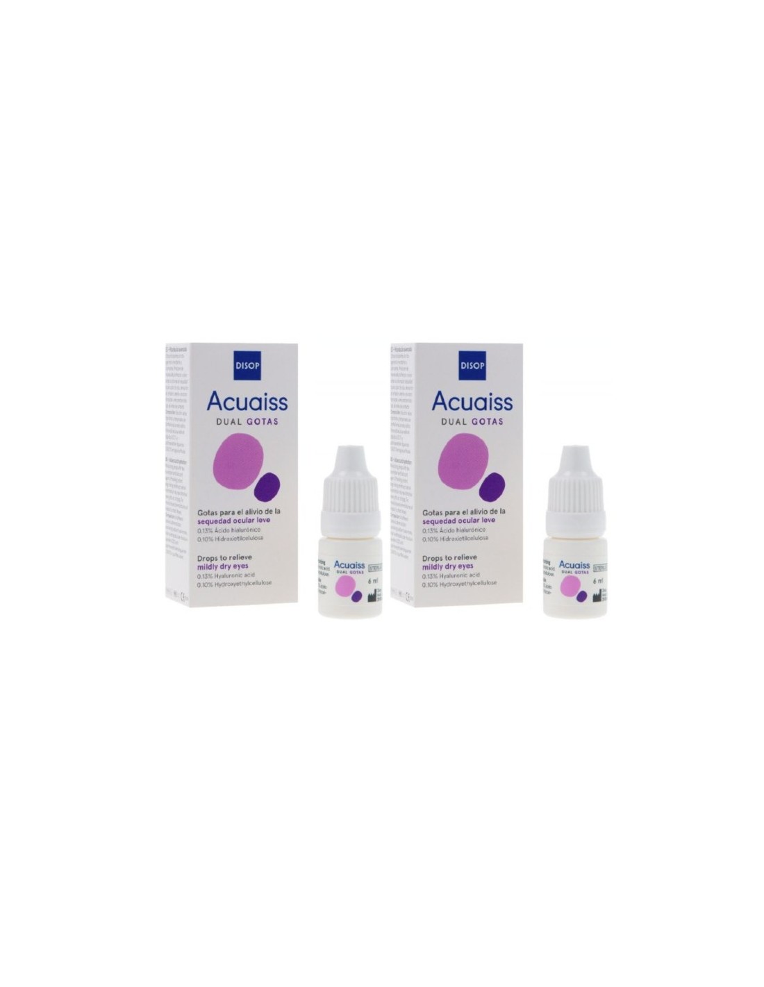 Acuaiss Dual Gotas 2x6 ml, es una lagrima para el tratamiento del ojo seco. Recomendada en casos de sequedad ocular puntual, enrojecimiento y molestias en épocas de alergias o en casos que no se solucionan con una lágrima estándar.