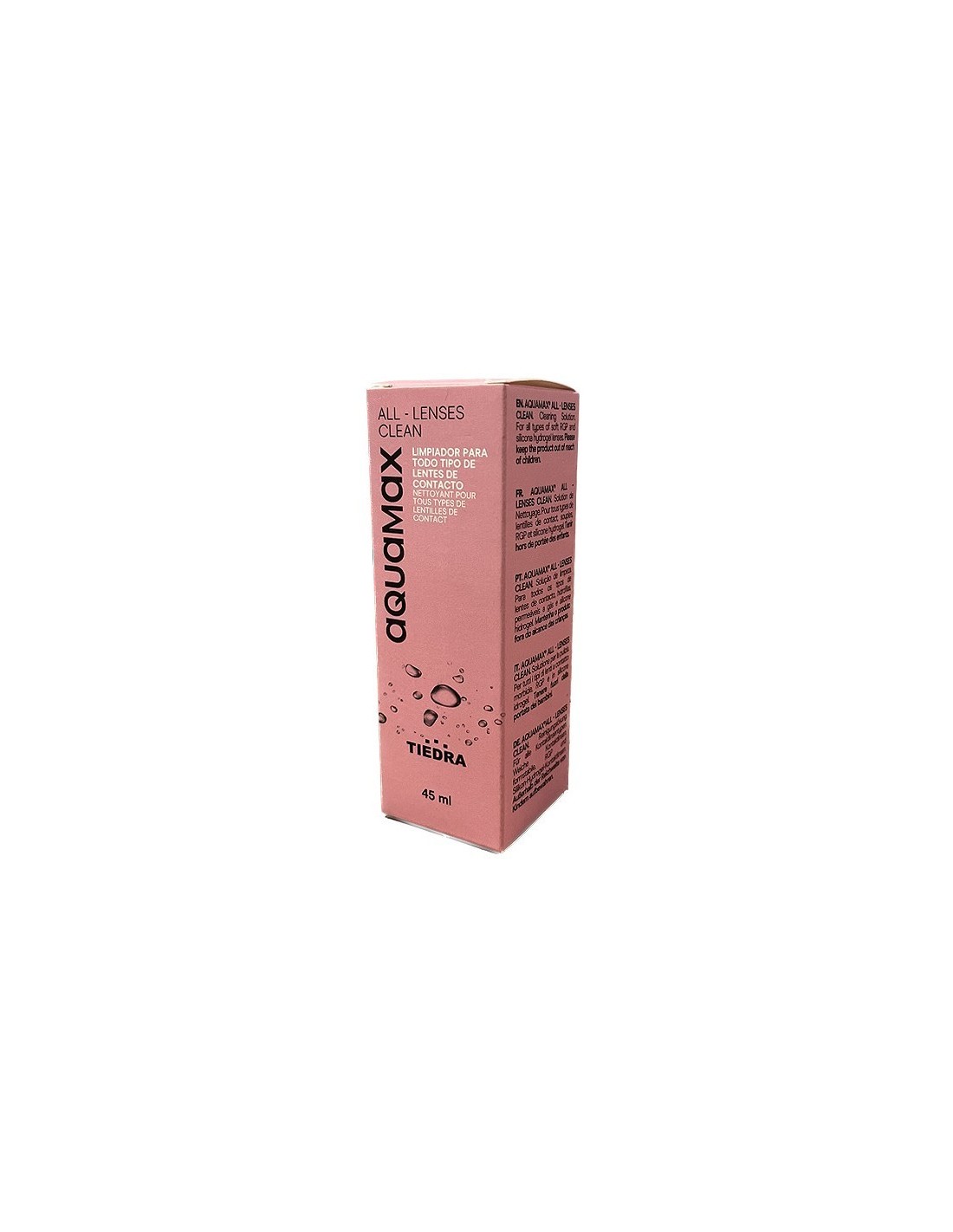 AQUAMAX ALL LENSES CLEAN 45 ml, es un limpiador y desengrasante con alcohol isopropílico para todo tipo de lentes de contacto, blandas de hidrogel convencional e hidrogel de silicona y RGP.
