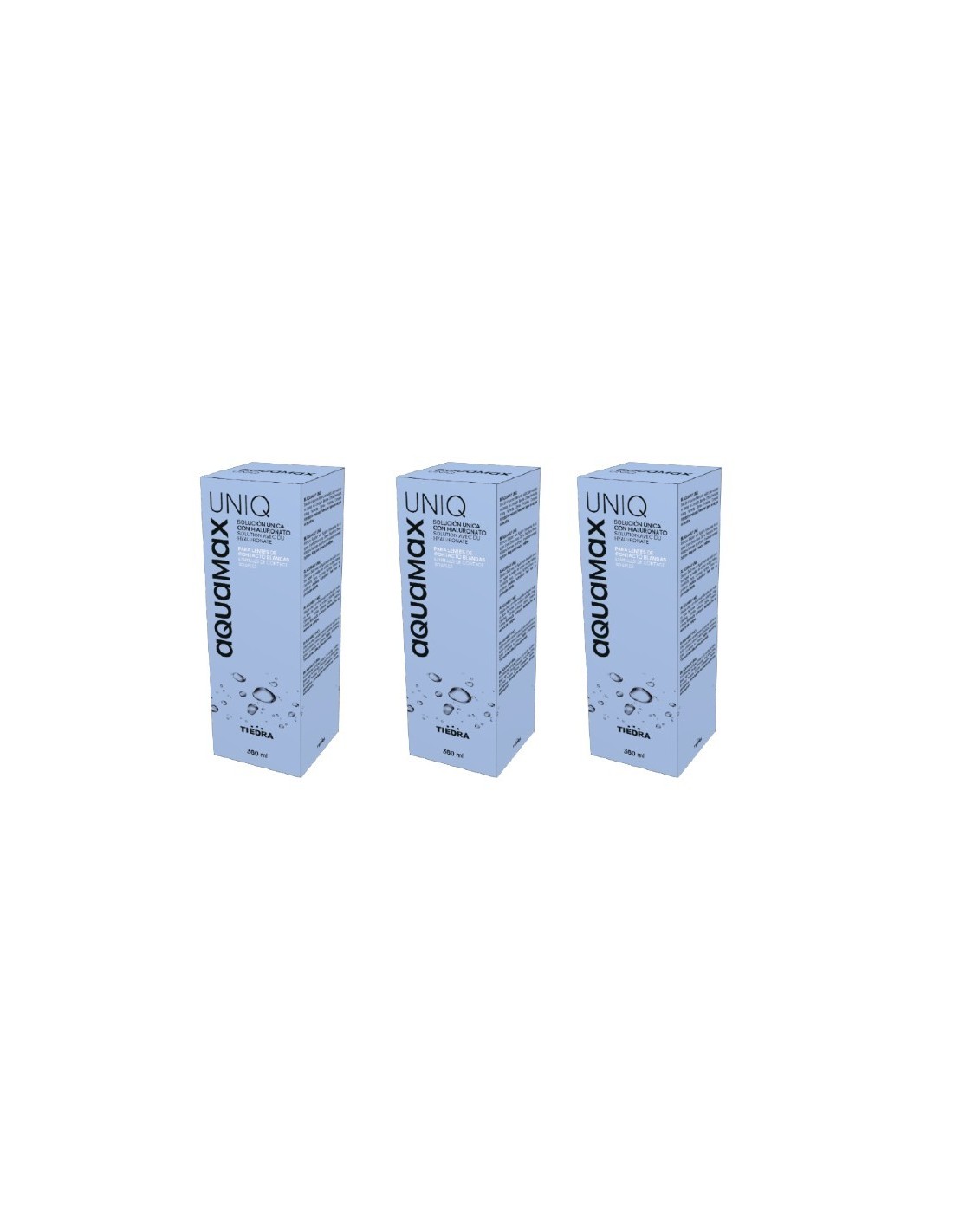 Aquamax Uniq 3x360 ml, es una solución a base de hialuronato sódico y poloxamer en una solución acuosa, isotónica y tamponada. Especialmente indicado para personas con ojos sensibles.