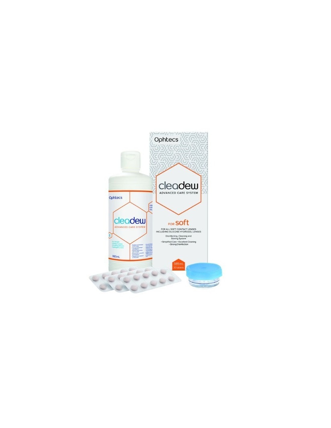 Cleadew for Soft (385 ml + 30 tabletas), es un sistema de desinfección para lentes de contacto blandas gracias a la povidona yodada.