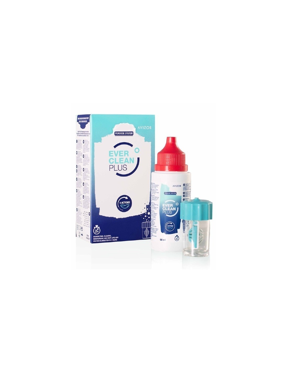El líquido limpiador Ever Clean Plus, consta de una solución de peróxido de hidrógeno, un comprimido bicapa de liberación retardada y un portalentes con válvula de presión.