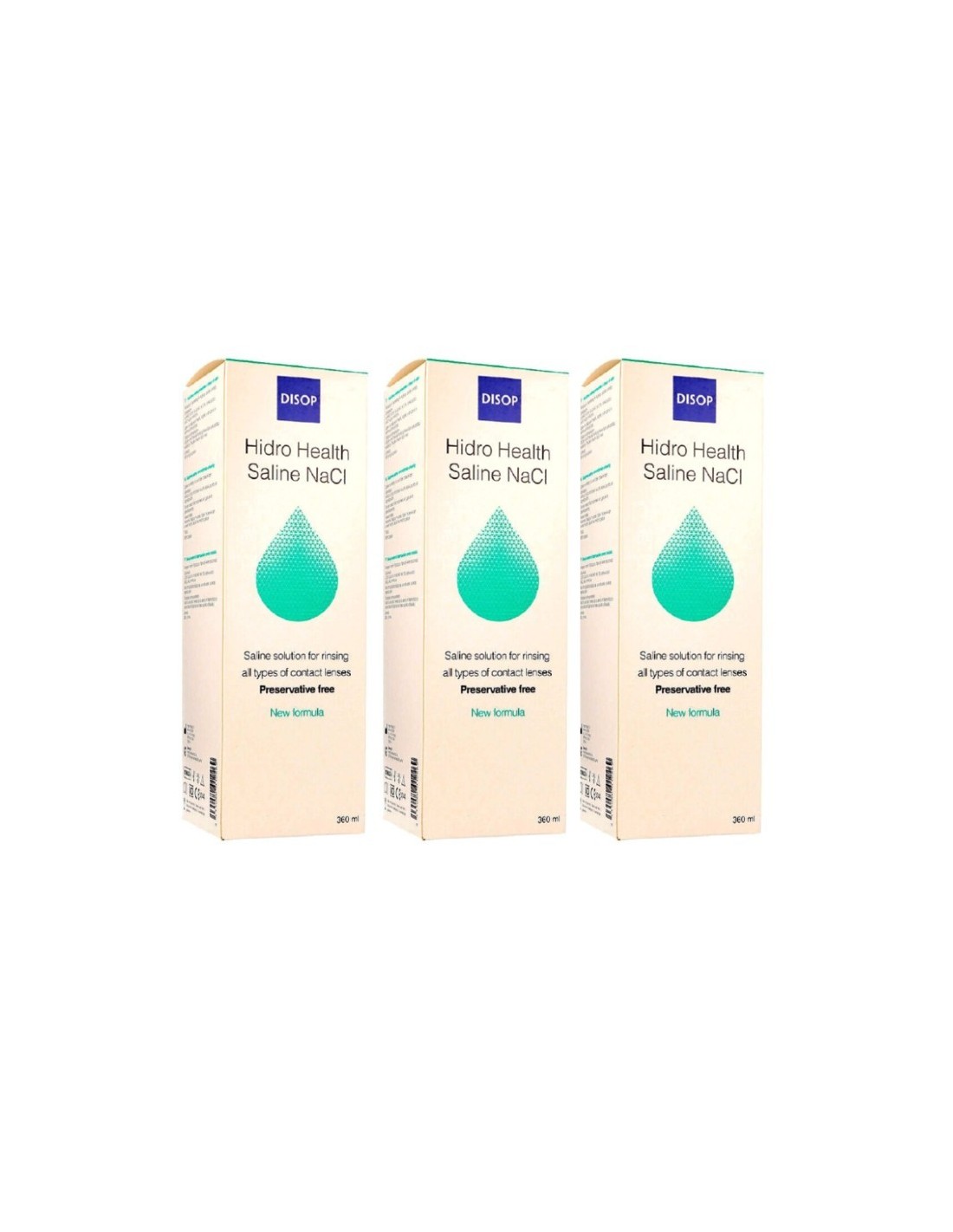 Hidro Health Saline NaCl 3x360 ml, es una solución salina isotónica y tamponada, para el aclarado y limpieza de todo tipo de lentes de contacto, también para la limpieza de proteínas.