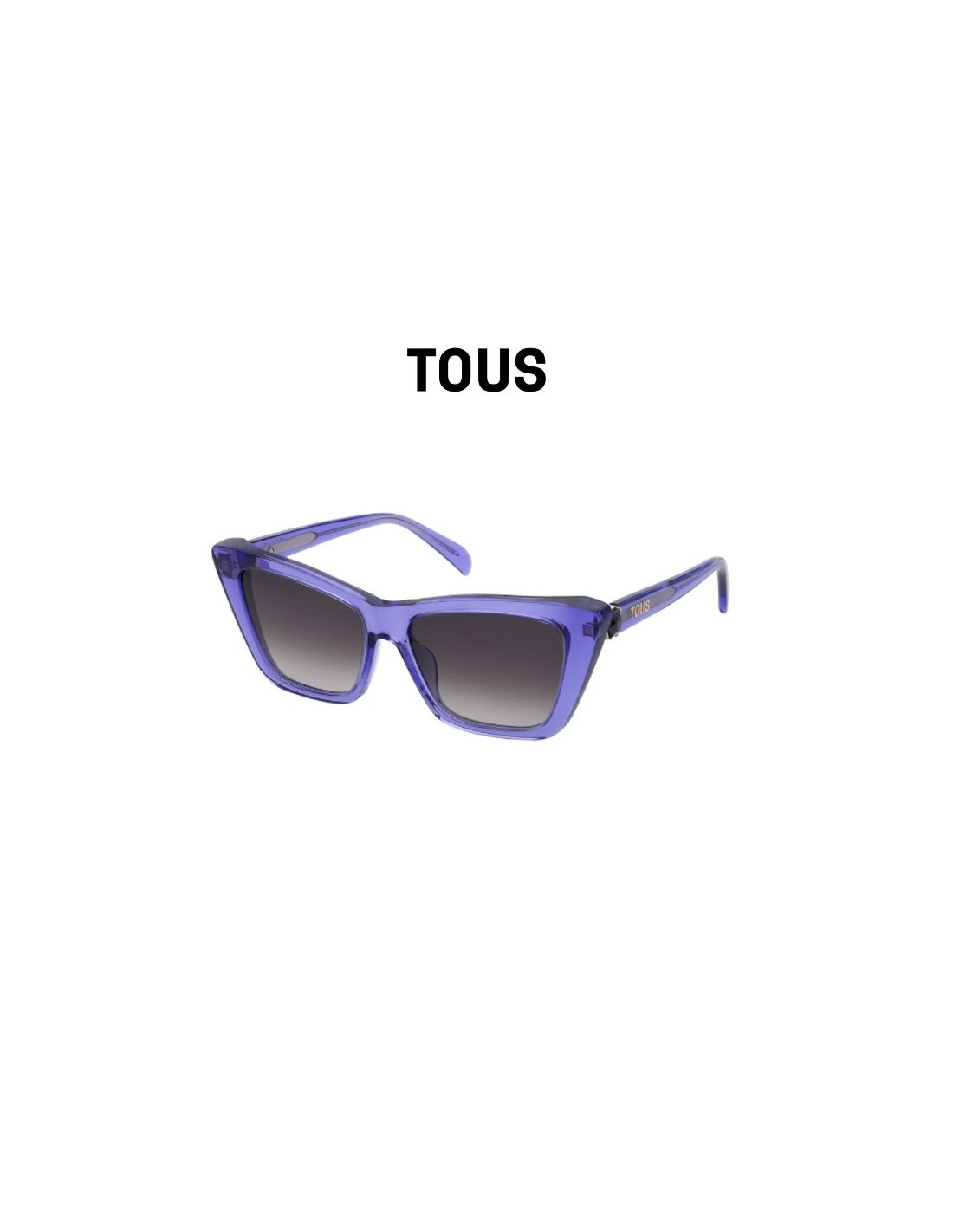 Las gafas de sol Tous STOB82V 0916 destacan por su color violeta transparente y detalle del logo del oso en la varilla.