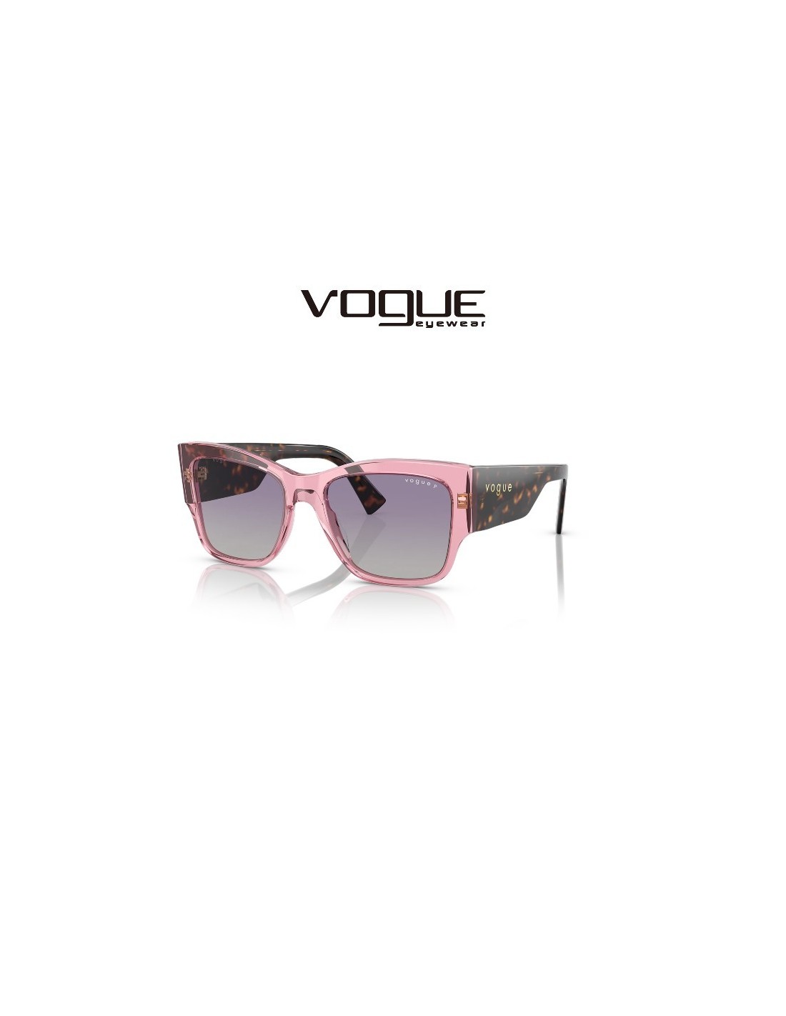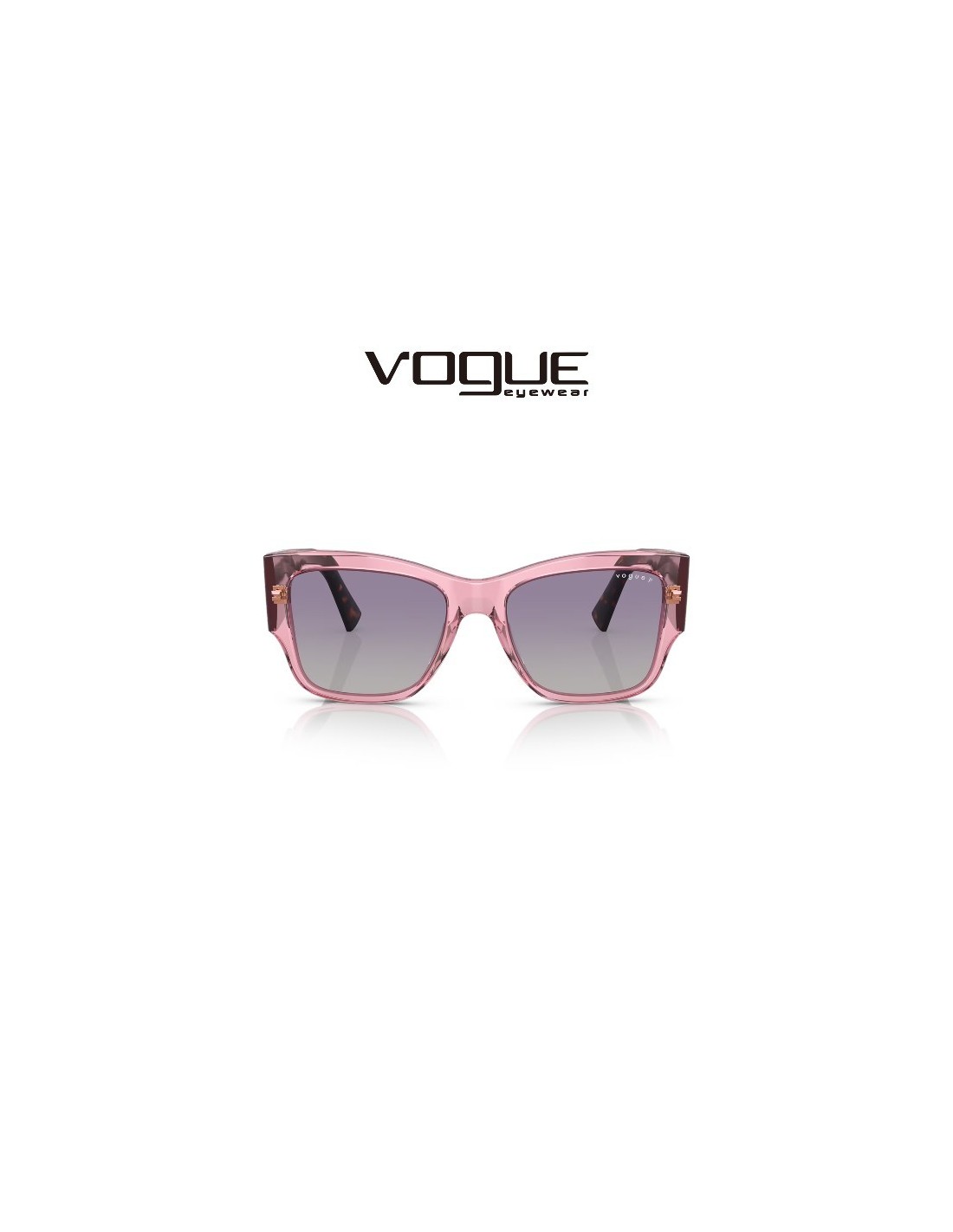 Las gafas de sol Vogue VO5462S 28368J destacan por su varilla ancha de tamaño grande típico de la marca. Tiene el color de montura rosa y cristales gris y violeta degradados y polarizados.